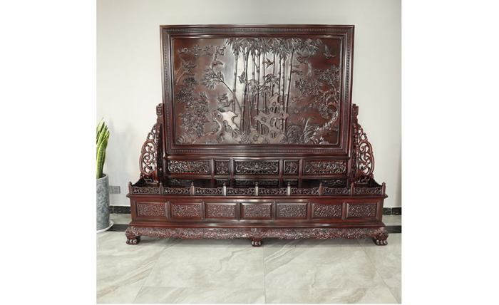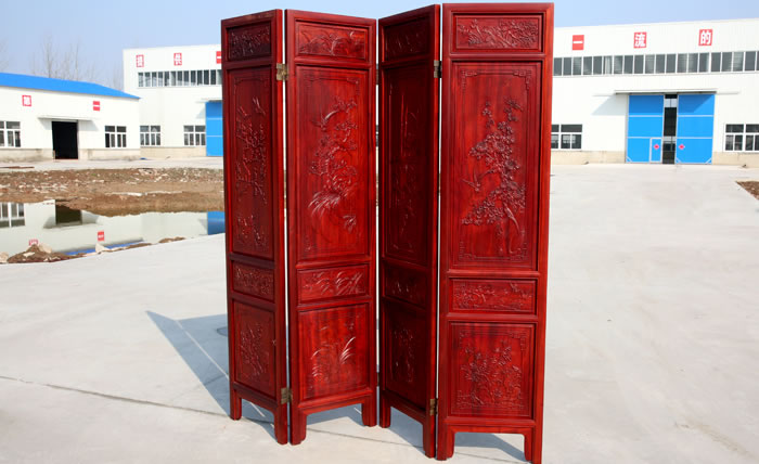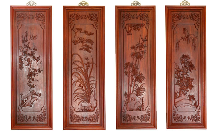 江蘇中尊木業(yè)有限公司屏風(fēng)系列產(chǎn)品:梅蘭竹匊掛屏、四季花折屏四件套等。