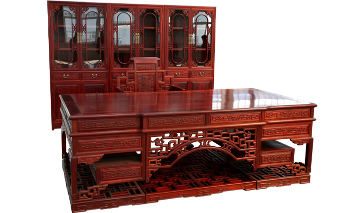 江蘇中尊木業(yè)有限公司書房系列產(chǎn)品:書房五件套草龍書柜、草龍大班枱、卷書寶座椅,洋花寫字枱等。