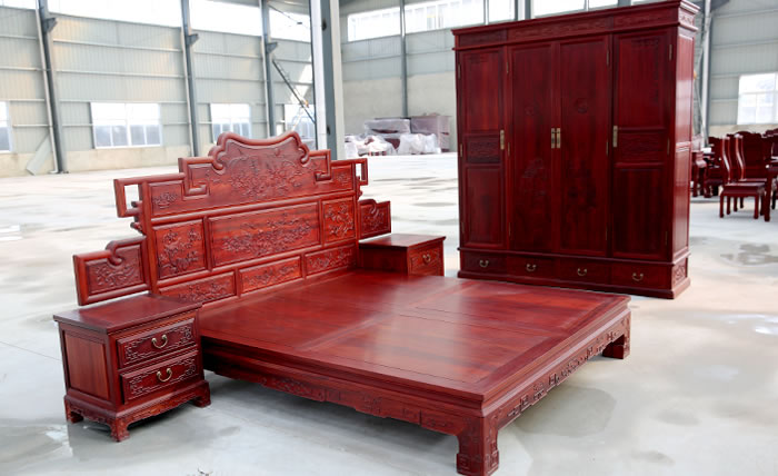 江蘇中尊木業(yè)有限公司臥室系列產(chǎn)品:佛光普照大佛龕,臥房四件套富貴大床、富貴大床床邊柜、四門衣柜等。
